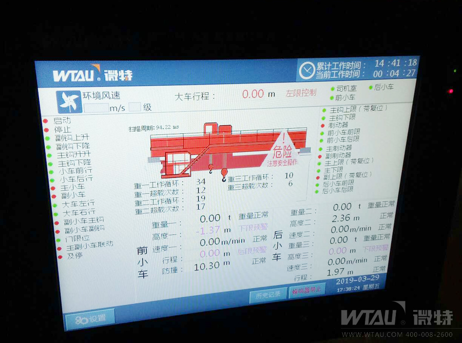 ▲微特WTSM-A型橋式起重機安全監(jiān)控系統(tǒng)主機顯示屏