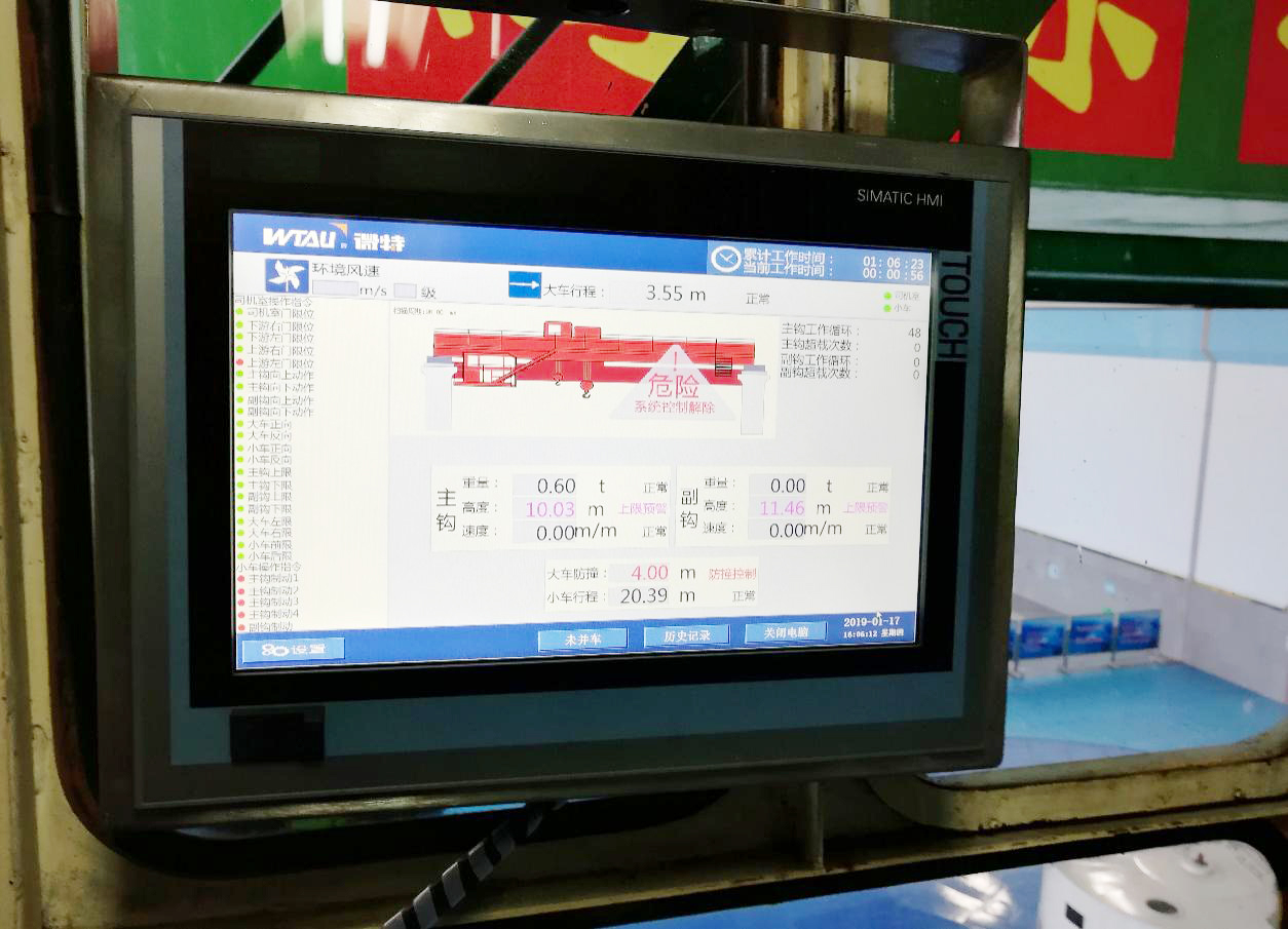 其橋門機使用頻率很高,所以電廠對橋門機的任何改造和增設項目都很重視,對于質(zhì)量要求極為嚴苛。在嚴格的施工制度下,微特細致的推進安裝調(diào)試工作。廠房兩臺橋機是最先完成安全監(jiān)控系統(tǒng)安裝調(diào)試的,在經(jīng)過了幾個月的使用后,各項參數(shù)顯示正確,系統(tǒng)性能良好。