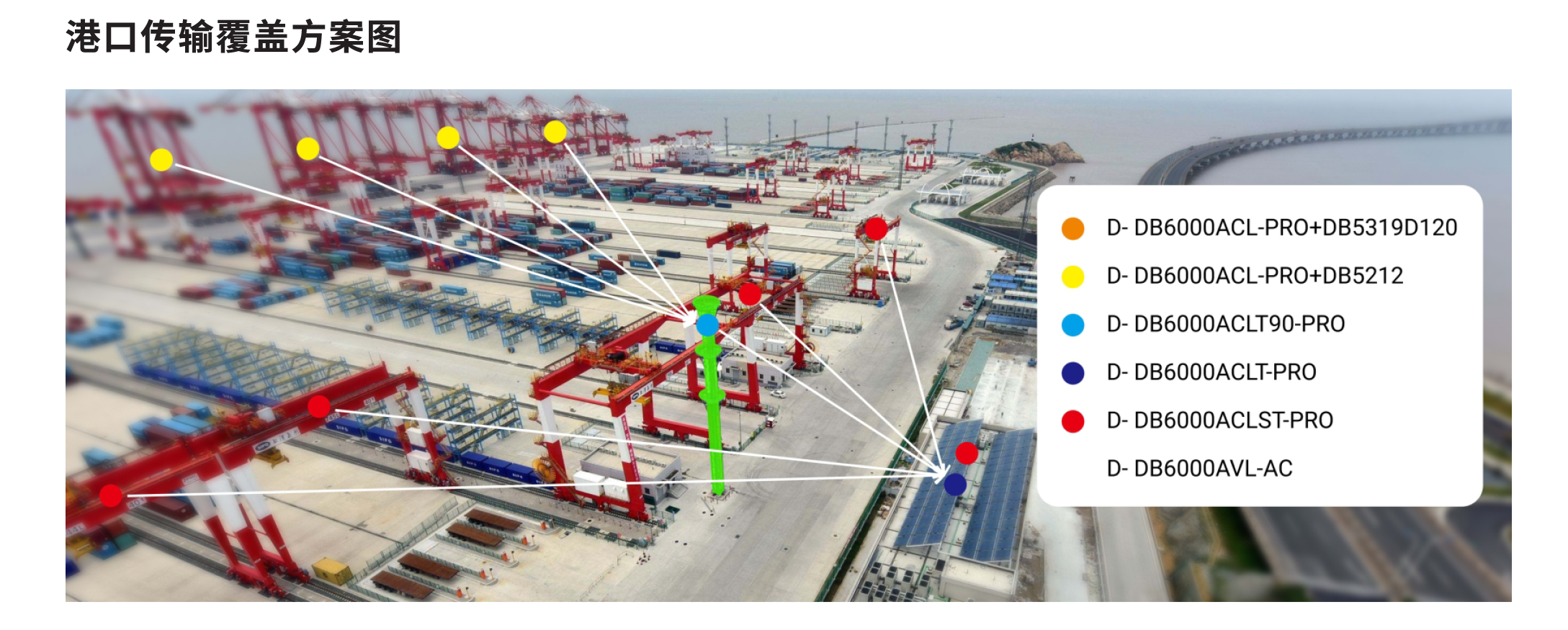 港口無線覆蓋方案:對于固定位置吊機(jī)可以采用點(diǎn)對點(diǎn)或多點(diǎn)的定向傳輸布局方式覆蓋,對于車載移動的設(shè)備可 以在吊車移動區(qū)域全向覆蓋在橋接定向傳輸?shù)牟季址绞健?br />