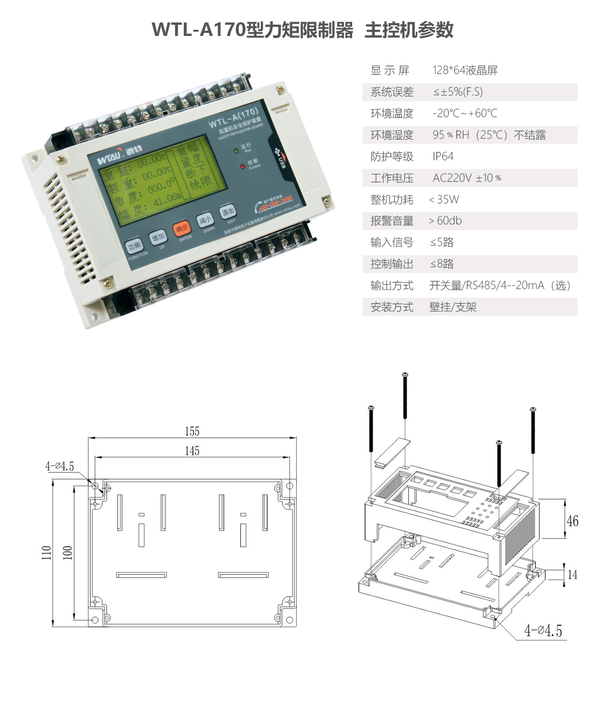 WTL-A170力矩限制器具有精巧,易安裝,成本低等特點。儀表自帶電氣柜滑軌卡槽可方便的安裝于電氣柜中。WTL-A170具有黑匣子記憶功能…… 主要用于兩路及以下重量信號及兩路角度信號、兩路吊鉤高度防過卷信號的監(jiān)控??捎糜陔p搖臂抱桿、汽車吊、履帶吊、門機、港口吊、等監(jiān)控信號較多的起重設備。 服務熱線: 400-008-2600 15007203040(微信同號) 付工