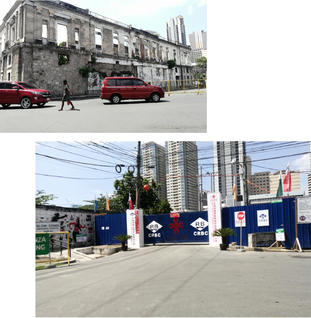 ▲滿目瘡痍的建筑旁邊,有一個掛著“中國援建”的項目正在施工中